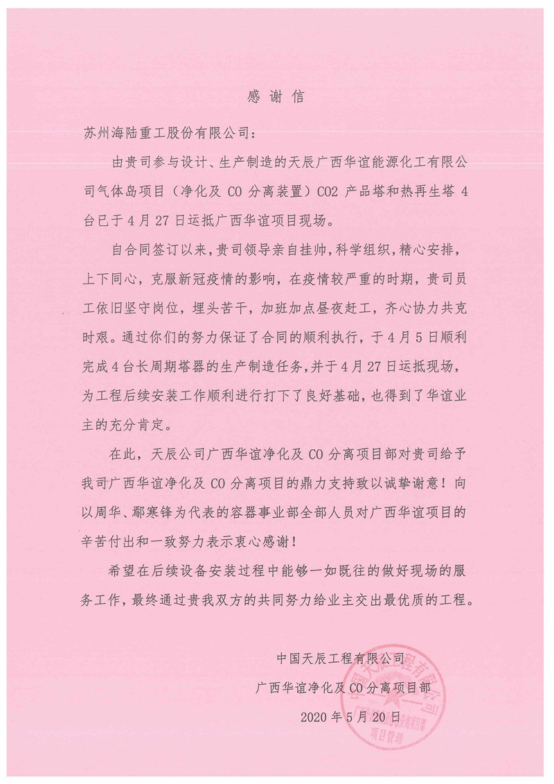 編后語:收到客戶的感謝信,我們的心中十分的激動,但小編還是要向每一位尊貴的客戶說一句:“這是我們應該做的,謝謝你們這么多年對我們海陸的關心和支持,我們海陸一定會做的更好?!?br /> 海陸重工作為國內一流的節(jié)能環(huán)保設備專業(yè)設計制造企業(yè),產品覆蓋鍋爐、壓力容器、核電、冶金及環(huán)保工程等多個產品領域,秉承“科技領航 業(yè)界先鋒”的理念,順應時代發(fā)展,致力于為實現(xiàn)國家節(jié)能環(huán)保的戰(zhàn)略目標做出更大貢獻。